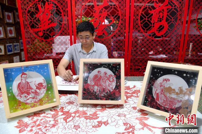8月4日,是中國傳統(tǒng)節(jié)日七夕節(jié)。河北省衡水市阜城縣剪紙藝人尤金水創(chuàng)作了《牛郎》《織女》《鵲橋相會》三幅“七夕”剪紙作品,傳遞千年浪漫情。據(jù)介紹,作品采用阜城剪紙陽刻的手法,裝裱后利用立體投影的方式,可以把畫面投影到“月亮”上,既浪漫又神奇。