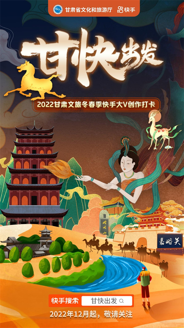 為加快推進(jìn)全省文旅行業(yè)復(fù)工復(fù)產(chǎn),激活冬春旅游市場(chǎng),甘肅省文旅廳聯(lián)合快手科技舉辦的“甘快出發(fā)”2022甘肅文旅冬春季快手大V創(chuàng)作活動(dòng)于12月16日啟動(dòng)。本次活動(dòng)整合快手文旅達(dá)人創(chuàng)作力量,10名來(lái)自全國(guó)的快手粉絲平均超過(guò)100萬(wàn)的大V組建成“甘快出發(fā)”2022甘肅文旅冬春季快手大V創(chuàng)作采風(fēng)團(tuán),于12月16日—31日分組分批次落地甘肅10城,以“狂想甘肅十大必體驗(yàn)?zāi)康牡?rdquo;為品牌創(chuàng)作方向,進(jìn)行甘肅文旅深度采風(fēng)和短視頻內(nèi)容制作,為網(wǎng)民呈現(xiàn)多元、細(xì)致、獨(dú)特的甘肅角度,打造獨(dú)有的“視頻甘肅”名片。