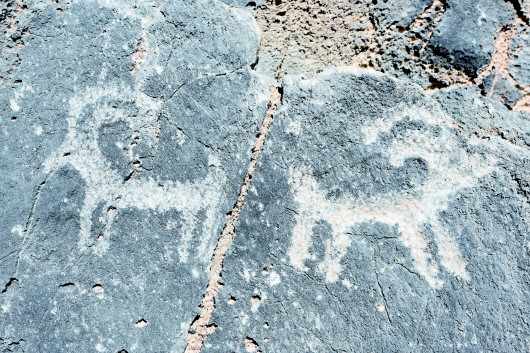 肅北縣大黑溝巖畫是全國重點(diǎn)文物保護(hù)單位,巖畫形成時(shí)間初步斷定在春秋、戰(zhàn)國至西漢時(shí)期,位于肅北縣城東約40公里處的大黑溝。巖畫共有34組,圖案190多幅,零亂分布在3.5公里長的山溝中,畫面內(nèi)容多為射獵、放牧、練武、乘馬作戰(zhàn)等場景和北山羊、野牛、野駱駝等動物,畫面表現(xiàn)形式多以凹刻和凸刻,巖畫大多刻在避風(fēng)向陽的陡峭花崗巖和石灰石上。