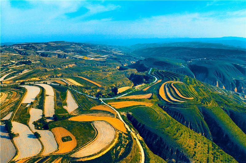 固原梯田分布于寧夏南部六盤山區(qū),始于上世紀(jì)60年代,是當(dāng)?shù)厝罕妶猿謶?zhàn)天斗地“坡改梯”、既種莊稼又種風(fēng)景,“一任接著一任干,一張藍(lán)圖繪到底”,精心打造的一項規(guī)模宏大的綠色生態(tài)工程。美輪美奐的梯田鑲嵌在黃土高原上的每一處褶皺上,條條田壟如鏈似帶,從山腳盤旋至山頂,層層疊疊,高低錯落,形成春賞山花、夏觀梯田、秋品紅葉、冬覽水墨的四季畫卷,被譽為最美的大地“指紋”“中國最美旱作梯田”,入選“中國美麗田園”10項梯田景觀之一。寧夏梯田看固原,固原梯田看彭陽。彭陽梯田既是黃土高原上梯田的縮影,也是黃土高原生態(tài)治理的典范。近年來,打造的金雞坪梯田公園、嘛喇灣梯田公園、青云灣梯田公園三大核心“五彩梯田”公園,每年4月“山花旅游節(jié)”游人如織,在“77號彩虹路”加持下,成為新晉網(wǎng)紅打卡地。