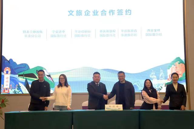 專題推介會上,平?jīng)鍪形幕瘡V電和旅游局推介了全市文旅資源及“引客入平”系列支持政策,崆峒山、大云寺·王母宮、龍泉寺、云崖寺等重點景區(qū)和涇川橙香瑤池溫泉酒店分別作了主題推介。平?jīng)鑫穆猛豆九c西安一帶一路文旅公司、涇川大云恒盛旅游公司與西安黃河國旅、崇信公劉文旅投公司與寶雞春暉旅行社、莊浪關山文旅投公司與寧夏新文化國旅、崆峒山國旅與重慶新旅程國旅、甘肅蘭神國旅平?jīng)龇止九c寧夏港中國旅、平?jīng)雎糜伟偈峦ㄅc西安金橋國旅等14家省內外旅行社分別簽訂“引客入平”客源互送合作協(xié)議。推介環(huán)節(jié)還進行了《神仙留戀的好地方》《崆峒武術魂》《折柳》和《春天的芭蕾》等文藝表演,與會嘉賓參觀了“問道崆峒·養(yǎng)生平?jīng)?rdquo;文旅形象圖片展、文旅產(chǎn)品市集、非遺技藝展示及網(wǎng)絡直播和非遺文創(chuàng)產(chǎn)品展。甘肅省文旅廳有關處室、各相關市州文旅部門負責人和省內外旅行商、文旅企業(yè)、媒體記者代表,平?jīng)鍪兄攸c景區(qū)、文旅投公司、文創(chuàng)企業(yè)代表共150余人參加。