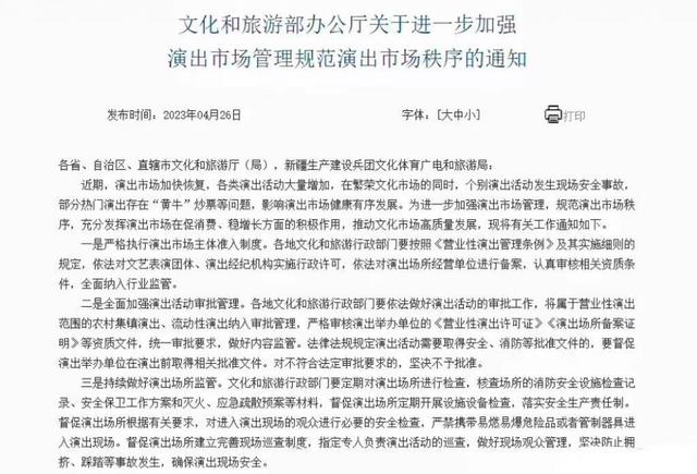 四是重點加強大型演出活動現(xiàn)場監(jiān)管。對臨時搭建舞臺、看臺的演唱會、音樂節(jié)等大型演出活動,文化和旅游行政部門要做好演出現(xiàn)場監(jiān)管,查驗演出舉辦單位的演出批準文件及相關(guān)手續(xù),核驗演員信息及演出節(jié)目內(nèi)容,嚴禁擅自變更演員及演出內(nèi)容,嚴禁假唱、假演奏等違法違規(guī)行為。要配合公安部門做好現(xiàn)場安全管理,堅決防范演出安全事故發(fā)生。