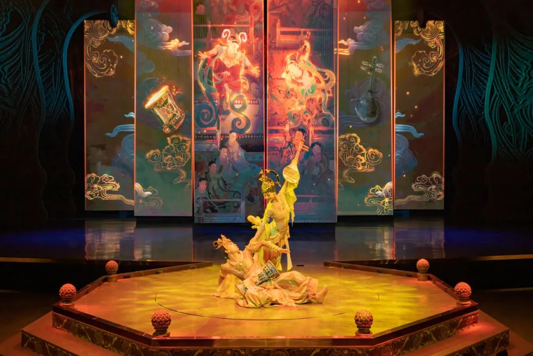 劇中運(yùn)用了五弦琵琶、排簫等民族樂(lè)器及敦煌仿制樂(lè)器,演繹了胡旋舞、琵琶舞等敦煌舞蹈,配合取材自敦煌古樂(lè)譜和西域曲調(diào)的劇目樂(lè)曲,還原了敦煌壁畫(huà)中的樂(lè)舞盛景。在演出模式上,《樂(lè)動(dòng)敦煌》打破了人和舞臺(tái)間的界限,讓觀眾置身劇場(chǎng),近距離感受敦煌傳承千年的古樂(lè)文化魅力。