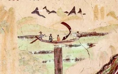 同樣是水上活動(dòng)的操舟,在敦煌壁畫中也有多種表現(xiàn)。無論是舟的形制,還是操舟者的運(yùn)行方式,都極為形象地展現(xiàn)在壁畫中。在時(shí)代為北周的莫高窟296窟中,有一艘正在水中航行,船體較短的獨(dú)木舟,尖頭尖尾,中間大、兩頭小。獨(dú)木舟中間乘坐三人,船頭船尾各有一名赤膊強(qiáng)健的水手在搖櫓與撐篙。這一畫面體現(xiàn)了人們于水中蕩舟的活動(dòng)場景。而在時(shí)代為初唐的莫高窟323窟中,壁畫中展現(xiàn)的操舟形象卻是另一番場景,畫面中的船雖然仍是一葉扁舟,但舟身上部設(shè)置了風(fēng)帆,用于劃船的櫓也很清晰,類似今天的搖櫓帆船。舟行水中,風(fēng)帆鼓浪,前有一人撐槳,整體呈現(xiàn)出一幅“風(fēng)帆欲起橫江上,水影遙看海上天”的運(yùn)動(dòng)場景(圖①)。