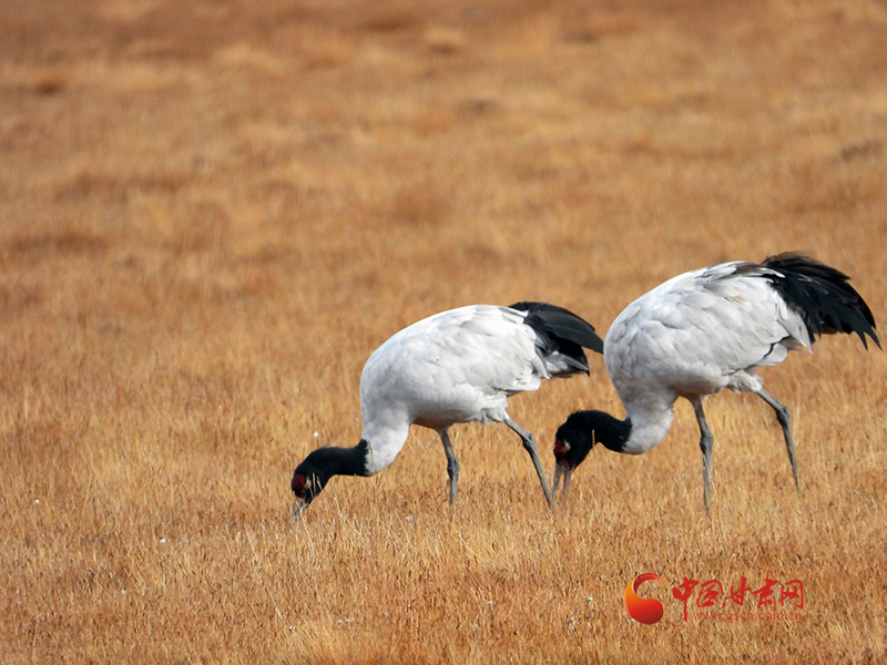 中國甘肅網(wǎng)10月17日訊 (西北角·中國甘肅網(wǎng)記者 張慧雅)近日,甘肅祁連山國家級自然保護(hù)區(qū)工作人員在轄區(qū)巡護(hù)時偶遇國家一級保護(hù)野生動物黑頸鶴歇息覓食的場景,兩只黑頸鶴漫步在一處濕地中一邊欣賞美景一邊享用美食。
