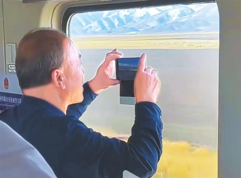 視頻中,一男子舉著手機,透過車窗面對著藍天、雪山、草原情不自禁地抒情:祁連山下,各族兒女兩千多年來在華夏的文明史上書寫了鞏固民族大業(yè)、實現(xiàn)祖國統(tǒng)一、民族繁榮的恢弘歷史。朋友們,來張掖!感受兩千年的絲綢之路,感悟現(xiàn)代的動車奔跑在祖國的大地上,讓中華在實現(xiàn)偉大復興的磅礴征程中恢弘勃發(fā)的新長征、新歷史。