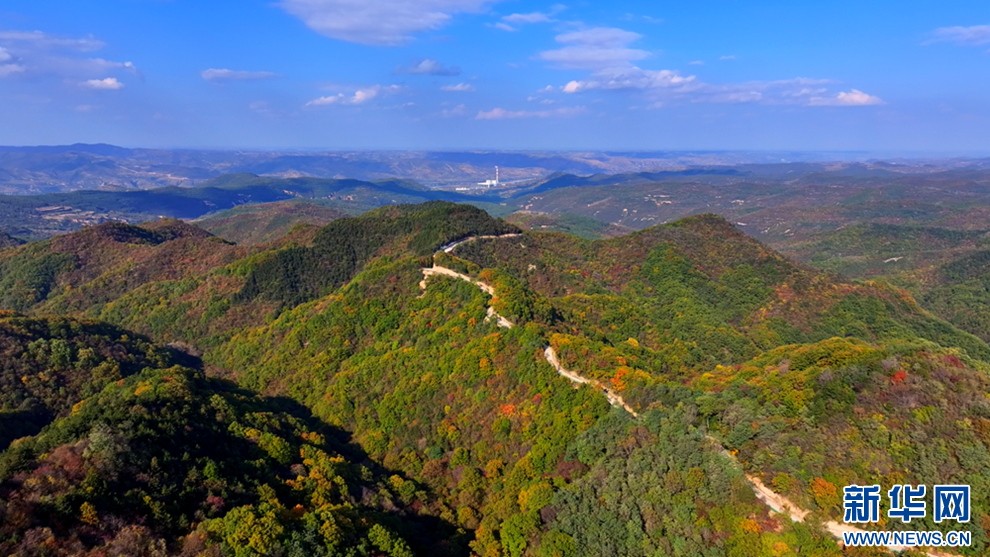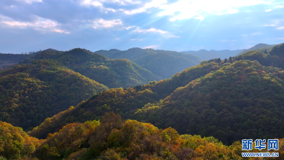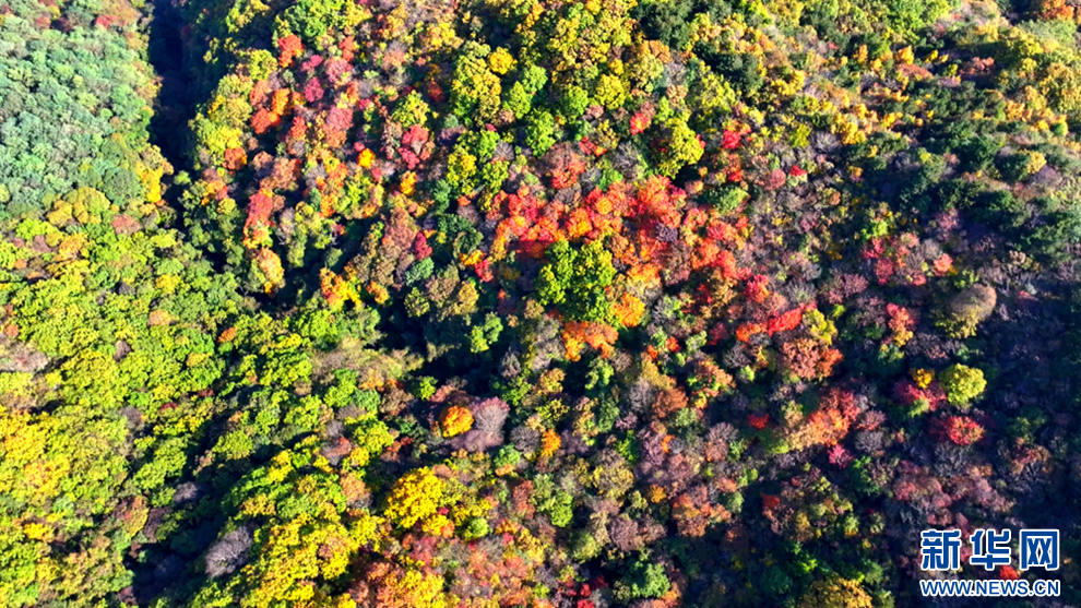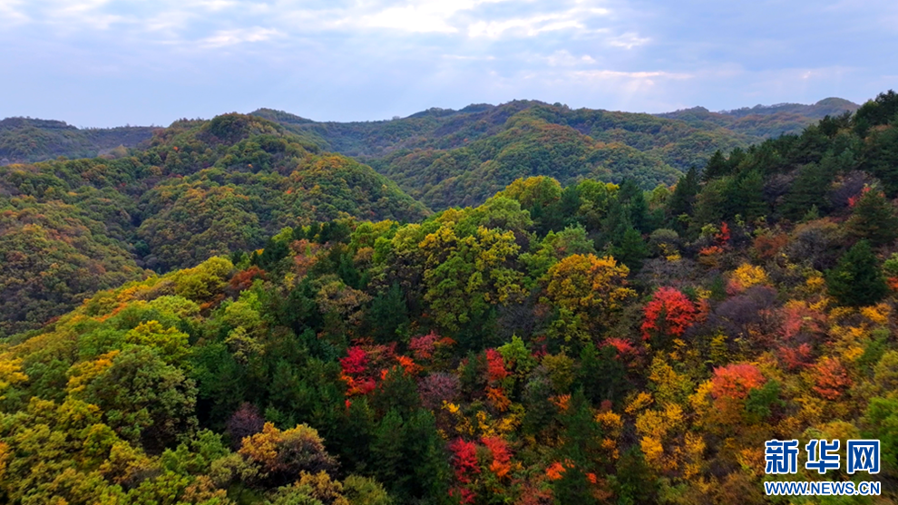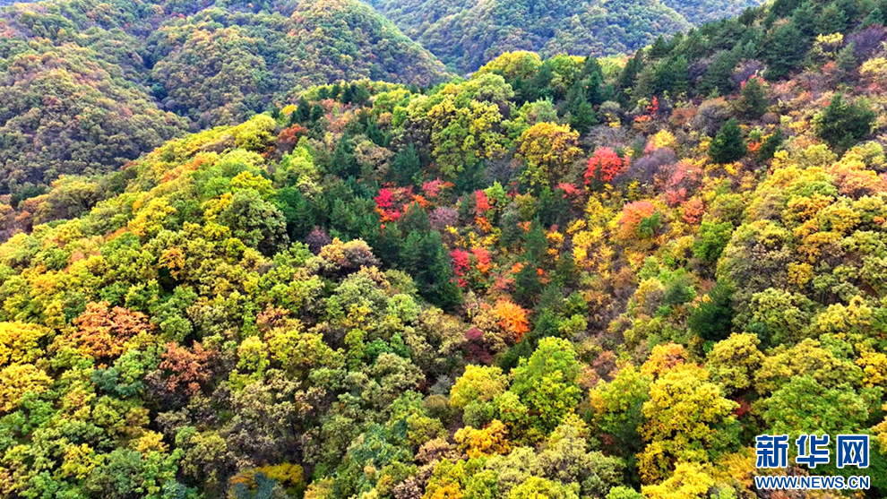 深秋時節(jié),甘肅省平?jīng)鍪谐缧趴h的唐帽山層林盡染,群山疊彩,勾勒出一幅絢麗多姿的美景圖。(圖片:高亮 文字:關改琴)