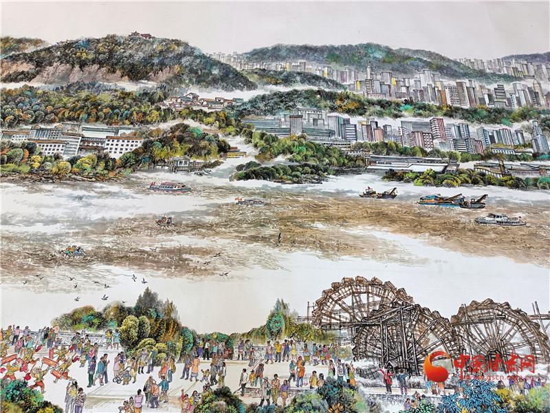 在《黃河之濱也很美》的長(zhǎng)卷中,有黃河母親雕塑,有中山橋,有白塔,也有城市規(guī)劃館,有羊皮筏子也有疏通河道的船。