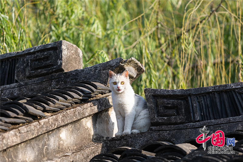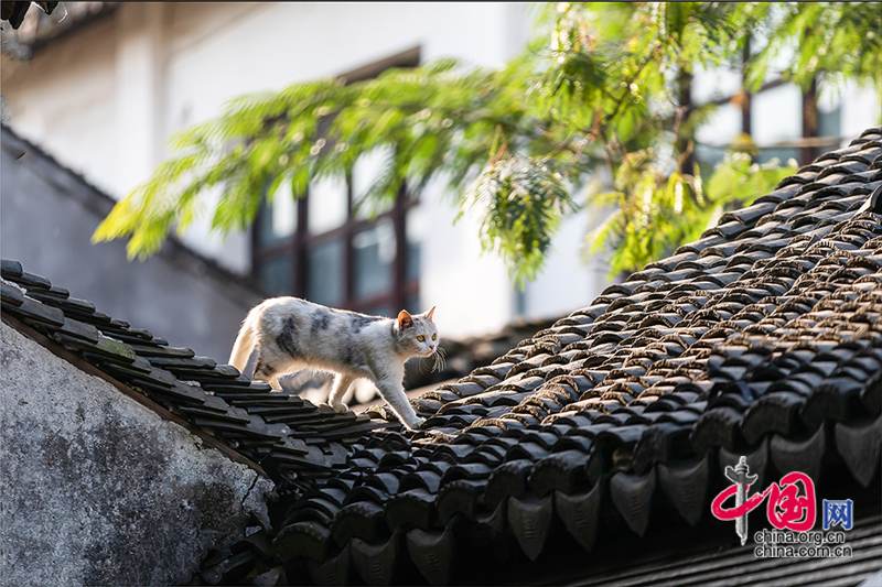 在毛孩子眼里,這就是包容一切活動(dòng)的「游樂場」,片片青瓦上留下梅花印?;蛟S你也該往古鎮(zhèn)的屋頂上瞧,檐角翹伸、清風(fēng)古韻,讓人心曠神迷?;蛲侵回堃粯优噬细咛帲拼翱茨撬菢?,那木門青瓦,就是江南水鄉(xiāng)的具象。