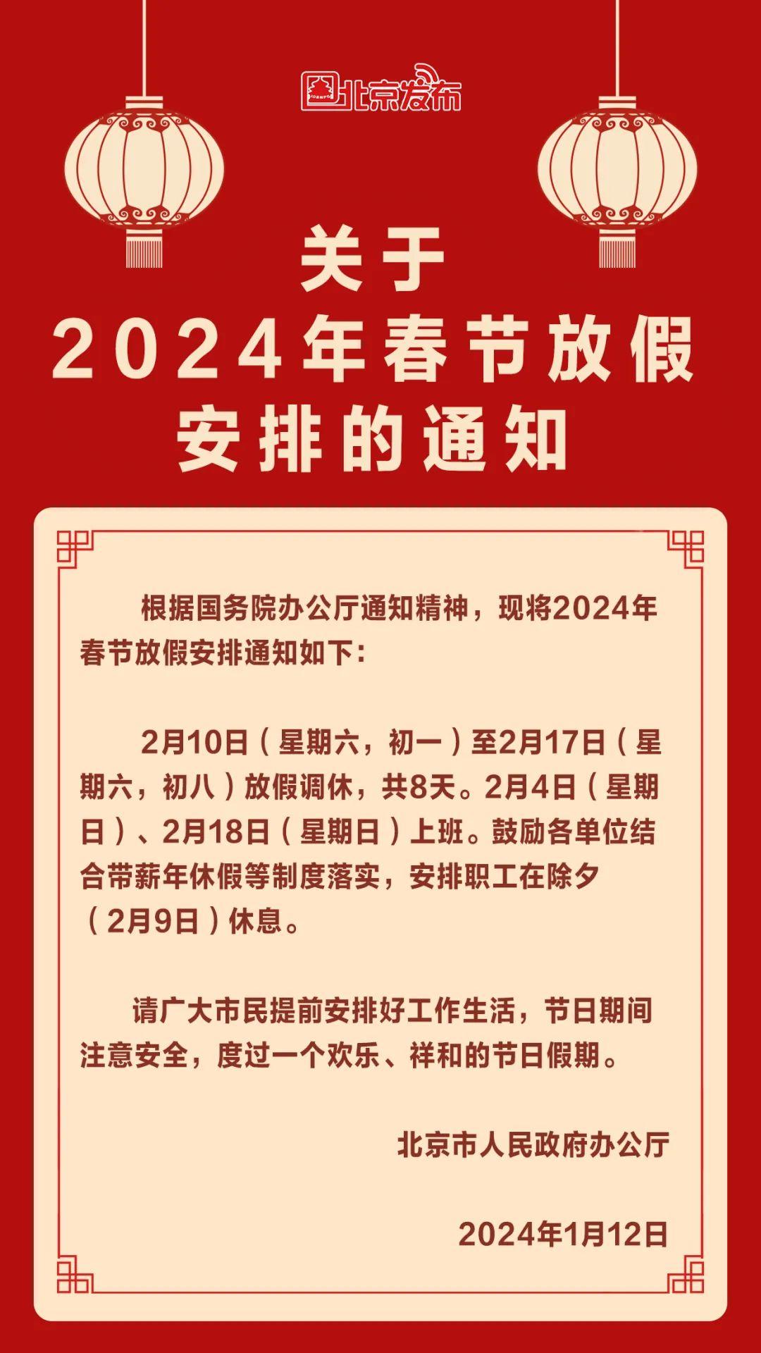 1月12日,北京市人民政府辦公廳正式發(fā)布關(guān)于2024年春節(jié)放假安排的通知。通知稱,2月10日(星期六,初一)至2月17日(星期六,初八)放假調(diào)休,共8天。2月4日(星期日)、2月18日(星期日)上班。