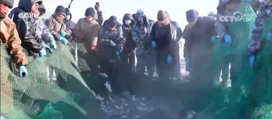 在克什克騰旗達(dá)里湖現(xiàn)場(chǎng),人工鑿冰、冰下走網(wǎng),冬捕隊(duì)員在作業(yè)時(shí)選用5公分網(wǎng)眼,這樣捕魚時(shí)就能漏掉小魚。馬拉絞盤將大網(wǎng)拖拽出網(wǎng)口,滿載魚兒的漁網(wǎng)慢慢地從湖水中出來,游客們感受豐收的喜悅。