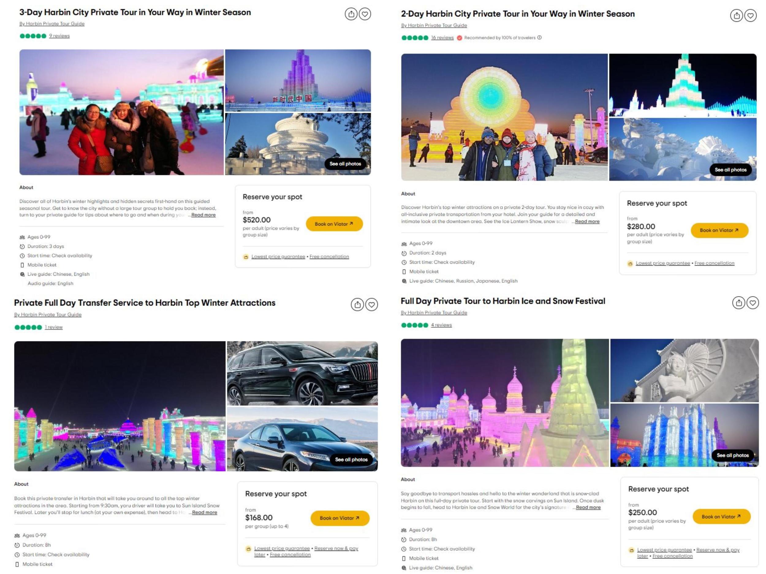 中新財經(jīng)查看Tripadvisor網(wǎng)站發(fā)現(xiàn),該平臺上有數(shù)十個關于哈爾濱旅游的服務。其中,“哈爾濱市冬季私人三日游”每位成人收費520美元起,“哈爾濱市冬季私人兩日游”每位成人收費280美元起,這兩個服務的費用不包括門票,包括私人導游服務、交通費(私人汽車或公交車/出租車)、酒店接送;“哈爾濱冬季熱門景點私人全日接送”每團收費168美元起(最多4人),費用不包括門票等,包括私人汽車、私人司機服務、燃油附加費。