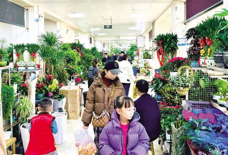 在市區(qū)花卉市場,花店已經(jīng)擺出了各種新春花卉,供市民選購。在雁灘花鳥魚市場,花香四溢,花團錦簇,枝頭掛著豐收喜悅的小金桔、高貴典雅的蝴蝶蘭、暗香浮動的臘梅、喜慶吉祥的富貴子、花團錦簇的杜鵑花……各種寓意美好的年宵花被擺放在花店的顯眼處。正值周末,市民陸續(xù)前來觀賞、選購。