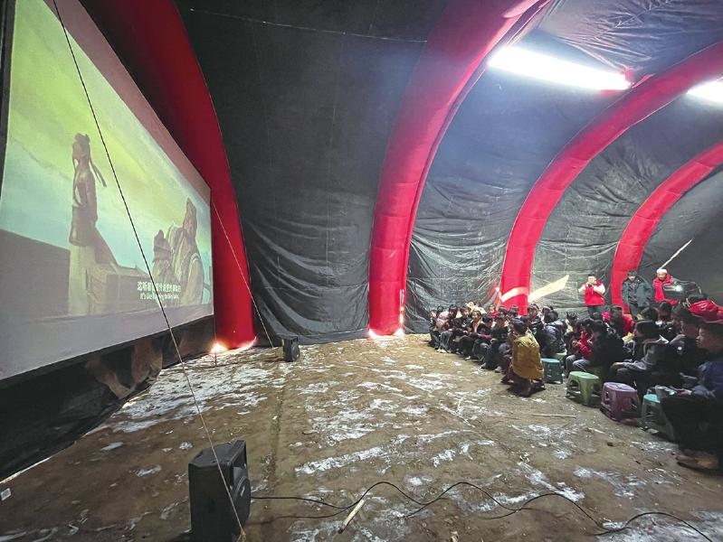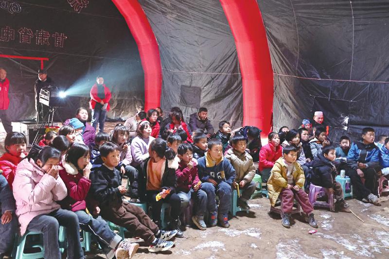 冬日的嚴(yán)寒擋不住震區(qū)群眾的觀影熱情。帳篷內(nèi),電影《英雄若蘭》《新神榜:楊戩》先后放映,孩子們分排而坐,被影片生動有趣、跌宕起伏的情節(jié)深深吸引,不時傳出歡聲笑語。“志愿者給我們放電影,豐富了我們的文化生活。”正在觀影的村民呂鵬說。