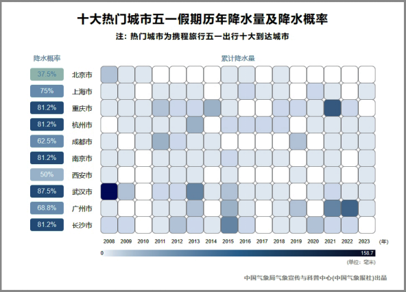 我們選取了攜程旅行公布的五一假期十大熱門旅游目的地,來(lái)看看自2008年以來(lái),熱門出行城市下雨的概率有多少?降水量大不大?