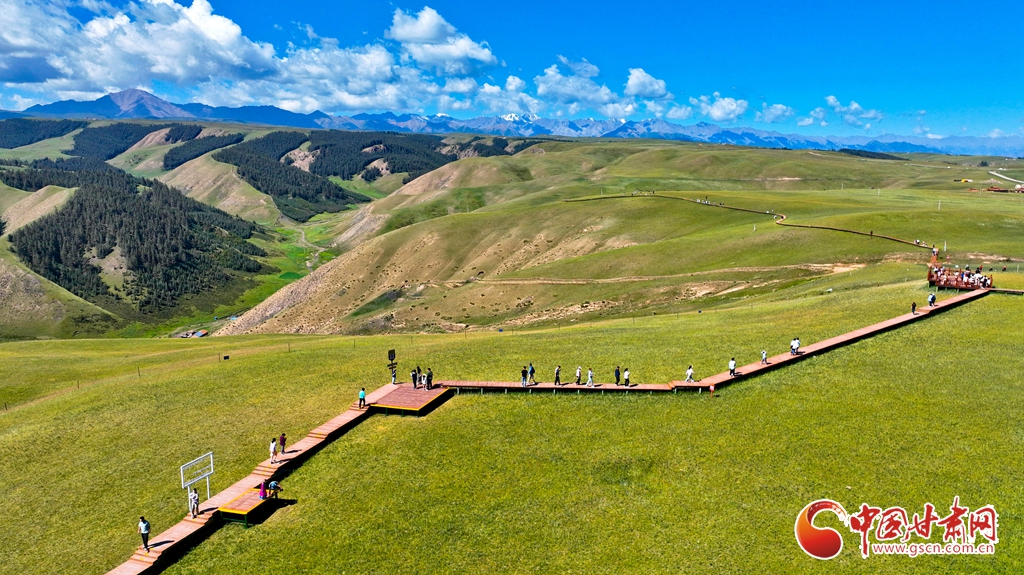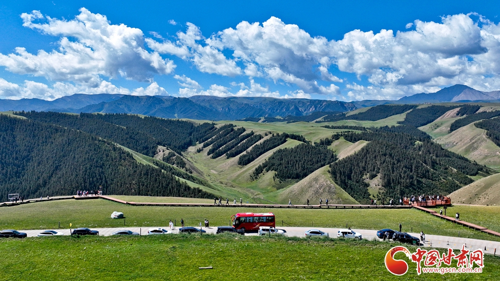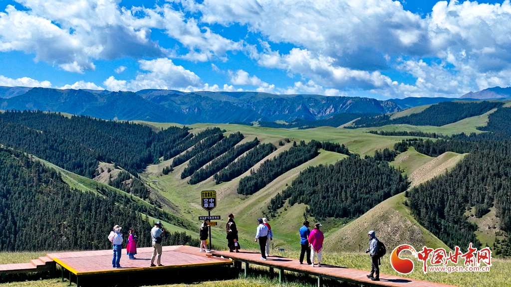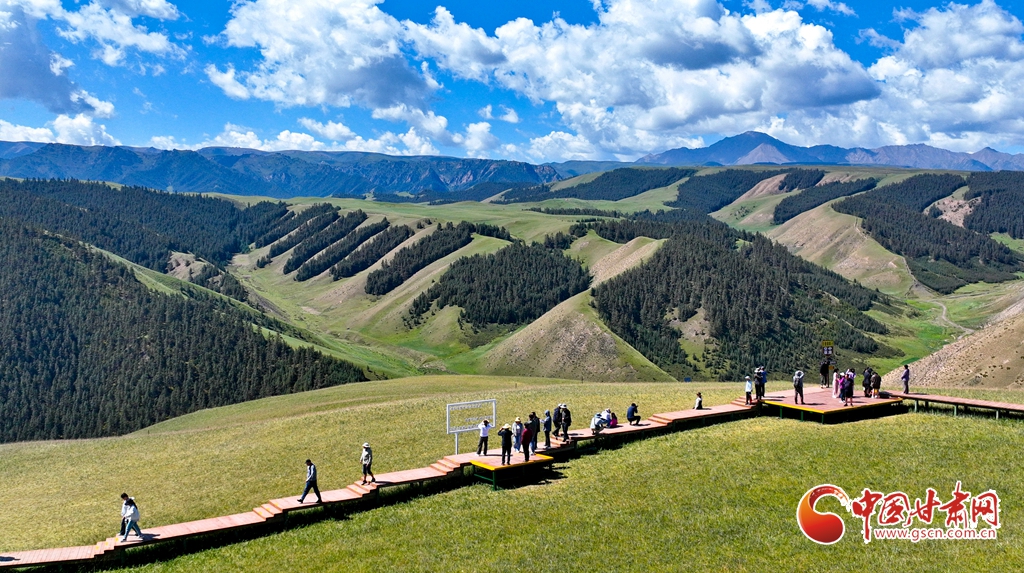 8月3日,祁連山國(guó)家公園甘肅省張掖市肅南裕固族自治縣康樂(lè)草原段迎來(lái)一年最美時(shí)光,游客在藍(lán)天、白云、森林、草原融為一體的旖旎風(fēng)光中拍照留念。