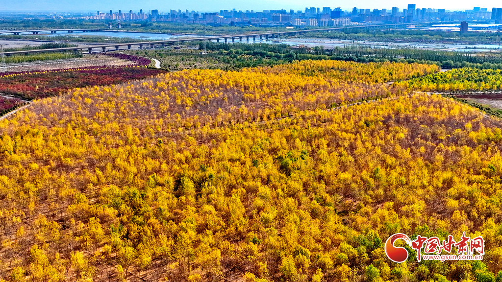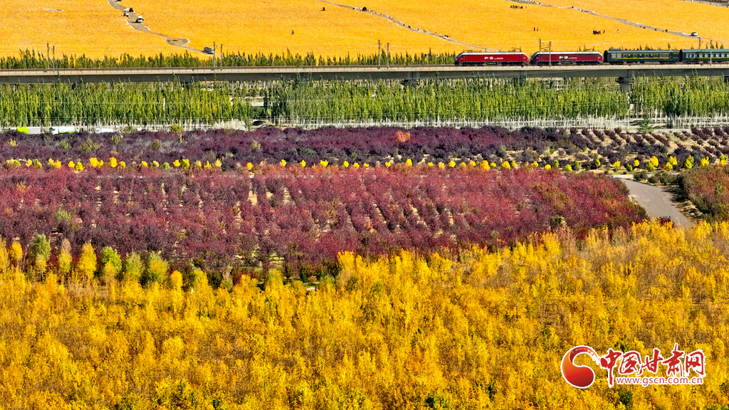 金秋時(shí)節(jié),張掖市甘州區(qū)的黑河兩岸,生態(tài)防護(hù)林的樹葉逐漸披上金色與紅色,景色迷人。尤其是那延綿的人工胡楊林景區(qū),金黃一片,層巒疊嶂,美不勝收。蘭新高鐵與連霍高速穿梭于這片林海之中,構(gòu)成了一幅動(dòng)人的風(fēng)景線。這里的空氣純凈、環(huán)境寧?kù)o、負(fù)氧離子含量豐富,成為了游客和市民休閑觀光的理想之地。