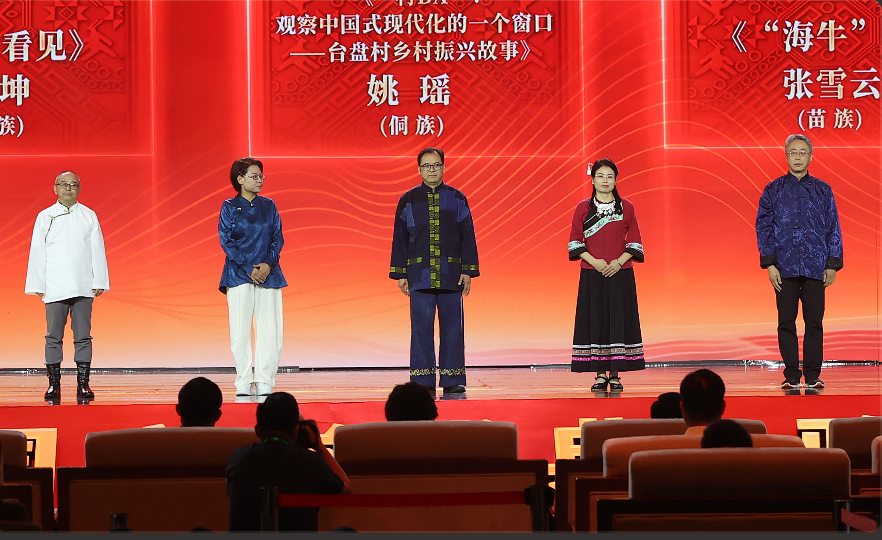 吉米平階、牛海坤、姚瑤、張雪云、周建新領(lǐng)取第十三屆全國少數(shù)民族文學(xué)創(chuàng)作駿馬獎報告文學(xué)獎。