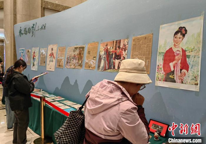 “永遠的劉三姐”小型展覽18日晚也在長安大戲院展出,各種版本《劉三姐》的劇本、歌本、歌片、節(jié)目單,與劉三姐相關(guān)的各種海報、唱片、郵品和老報紙等展品吸引觀眾紛紛駐足。