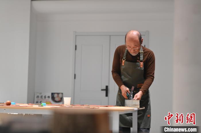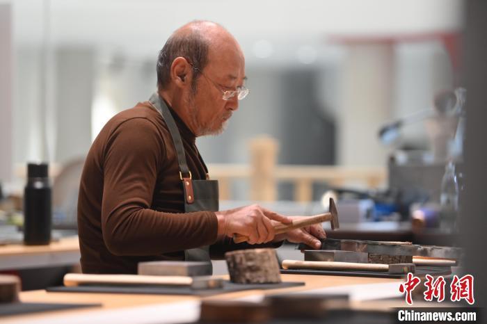 11月23日,甘肅省蘭州市楊樹珍剪紙工作室內(nèi),工匠名師劉金碌制作剪紙漢服作品的金屬帽邊。中新社記者 李亞龍 攝