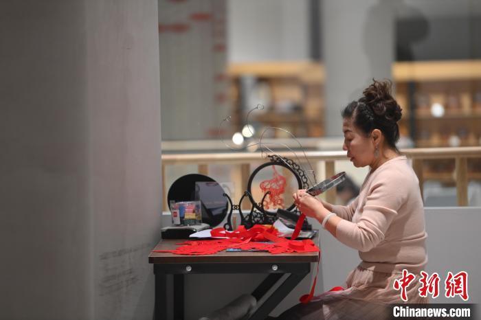 11月23日,甘肅省蘭州市楊樹珍剪紙工作室內(nèi),楊樹珍制作剪紙漢服。中新社記者 李亞龍 攝