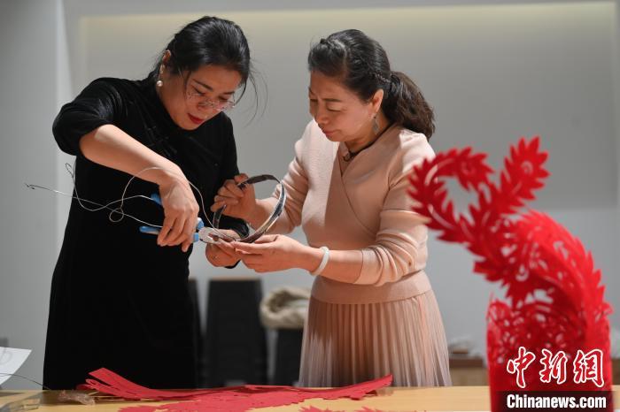 11月23日,甘肅省蘭州市楊樹珍剪紙工作室內(nèi),楊樹珍(左)帶領(lǐng)團隊成員制作剪紙漢服。中新社記者 李亞龍 攝
