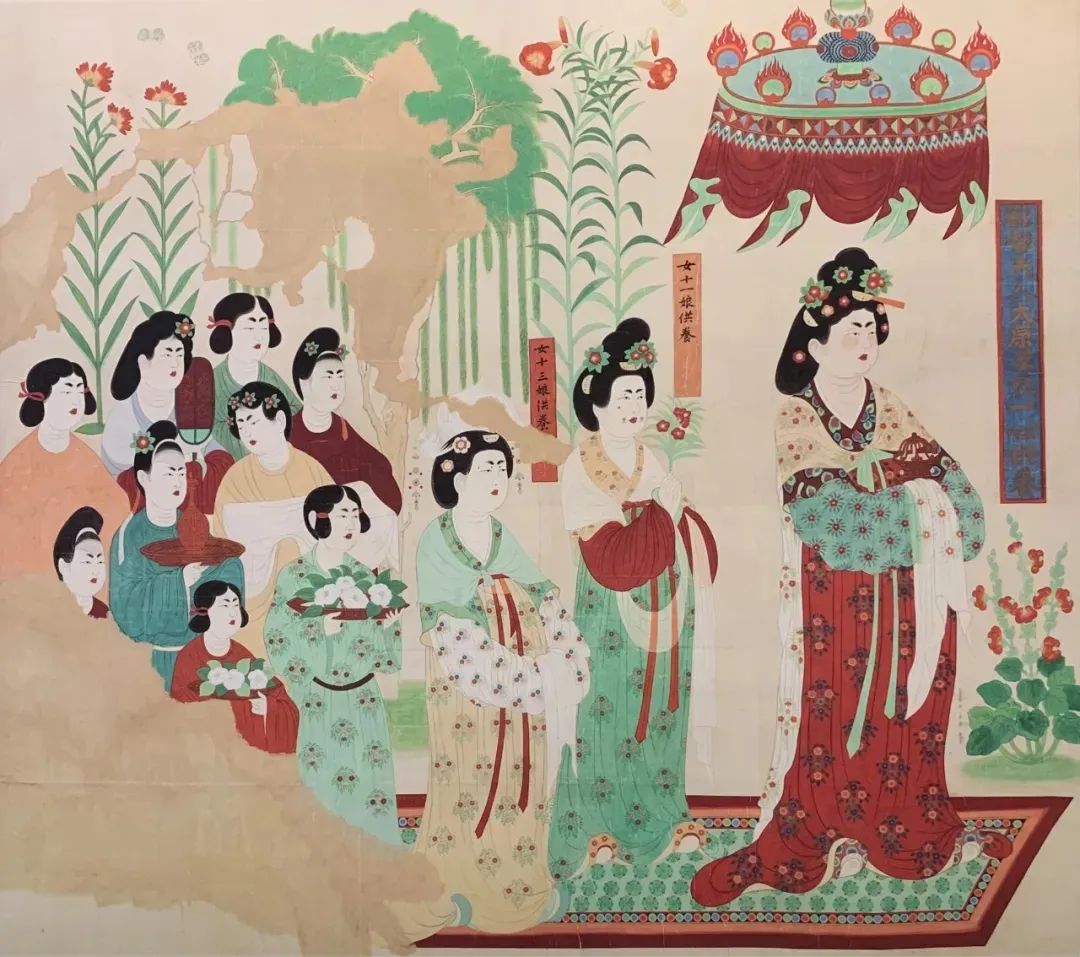 ?。?)莫高窟第130窟飛天壁畫修復(fù)當(dāng)我在第161窟修復(fù)壁畫時,突然聽到洞窟外一聲巨響,我猜想,應(yīng)該是洞窟發(fā)生了坍塌。于是我趕緊循聲而去,發(fā)現(xiàn)發(fā)出巨大聲響的是第130窟,第130窟北壁上部壁畫為飛天,其中空鼓壁畫大面積脫落,有2平方米多。脫落的壁畫掉在了佛腳上,碎成了一地。未脫落壁畫的邊緣十幾厘米都已脫離墻壁,隨時有脫落的風(fēng)險。我于是向常書鴻先生匯報,然后我們上報國家文化部。國家文化部批示,對第130窟進行加固維修。
