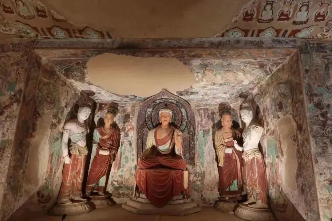 經(jīng)歷了8年的復(fù)原方案討論、實驗及準備,2000年,從南湖店搬來兩個洞窟,被安置在莫高窟北區(qū)大沖溝新建的兩個洞窟內(nèi)。關(guān)于洞窟壁畫的復(fù)原,我們采取了掛壁畫的方法,這是一種獨創(chuàng)的方法。壁畫是掛在埋入墻體的角鋼架上的。首先做好定位,掛起的壁畫暫時固定,等待全窟壁畫拼裝結(jié)束,檢查準確無誤后,將掛起的壁畫牢固地固定在角鋼架上,并將壁畫背面的鋸縫隙用麻泥填充。我們算是開創(chuàng)了壁畫搬遷修復(fù)的新方法。20多年多去了,如今兩個搬遷洞窟的壁畫及塑像保持狀態(tài)良好。對塑像的保護,就是對其中一個洞窟內(nèi)僅存的兩身佛、一身菩薩進行搬遷和復(fù)原。把佛像和菩薩像與崖體分離,牢固地包裝好塑像,然后運送至莫高窟。最后,將塑像按照原有位置及關(guān)系進行了復(fù)原。