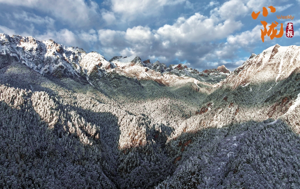 積雪如同軟綿綿的地毯鋪滿了整個官鵝溝,陽光透過云層照射在這片被雪覆蓋的世界,閃爍著溫柔的光芒。