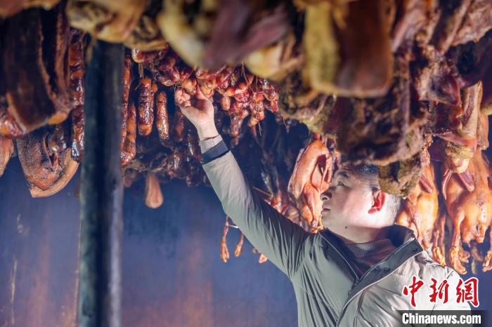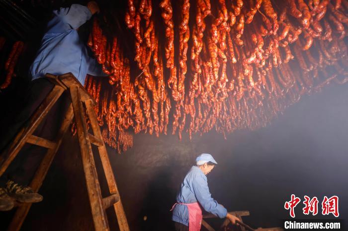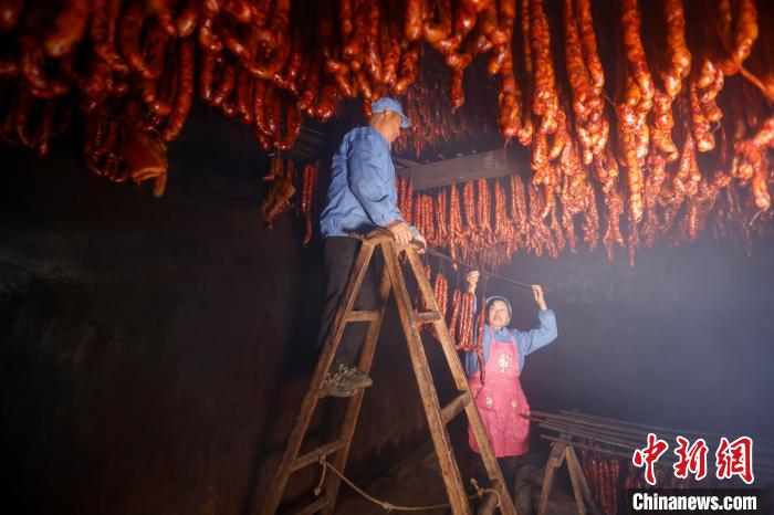 圖為貴州施秉一企業(yè)工人在下架剛熏制好的香腸。新年臨近,貴州省黔東南苗族侗族自治州施秉縣部分農(nóng)戶和企業(yè)紛紛加工趕制臘肉、香腸、血豆腐等傳統(tǒng)臘味,通過“線上+線下”銷售方式,供應(yīng)市場(chǎng),喜迎新年。磨桂賓 攝