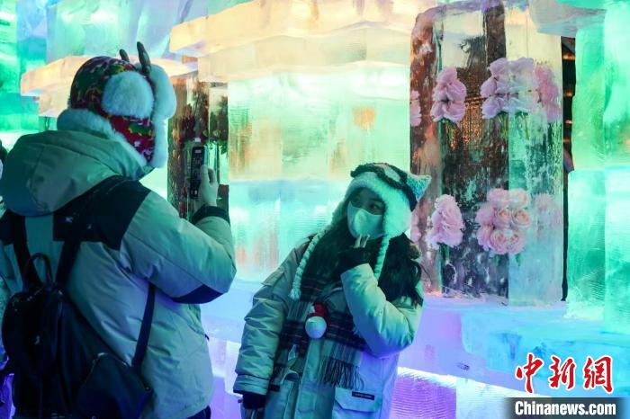 游客在哈爾濱冰燈藝術(shù)游園會(huì)打卡拍照 趙宇航 攝