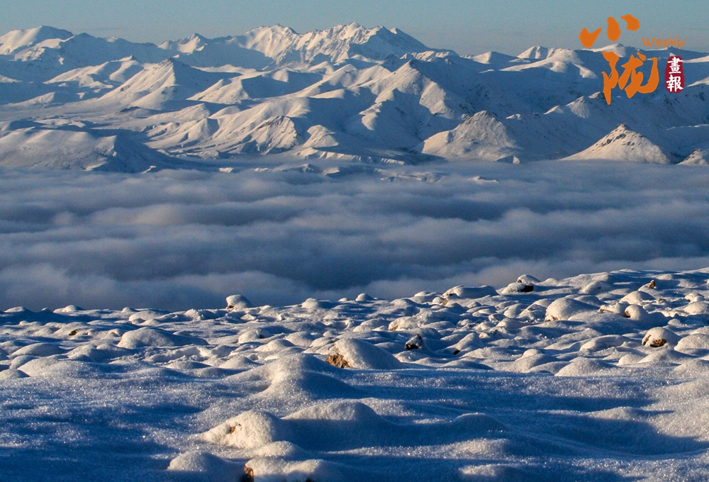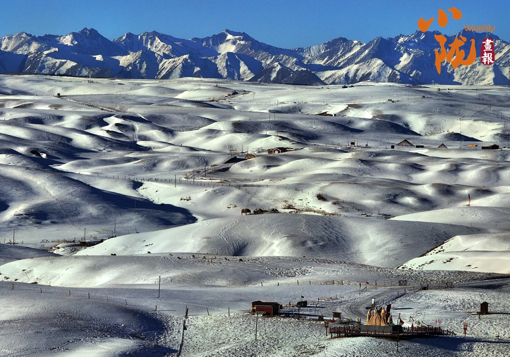藍(lán)天如洗,鋪滿白雪的草原,與群山相映,蒼茫無際,呈現(xiàn)出安然素美的意境。