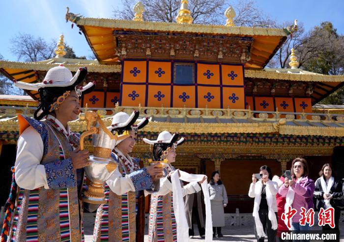 圖為歡迎儀式現(xiàn)場,工作人員向香港游客敬獻(xiàn)青稞酒。中新社記者 李林 攝