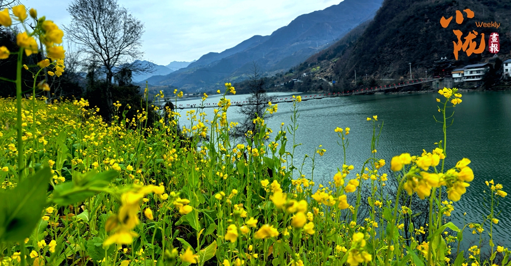 微風輕拂,朵朵油菜花隨風搖曳,與湛藍的河水相互映襯,如詩如畫。