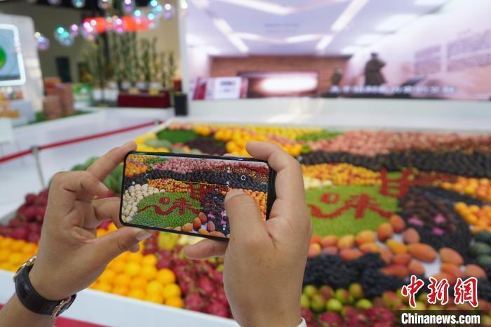 2022年7月10日,第二十八屆中國蘭州投資貿易洽談會展區(qū)展示甘肅地方特色產品。圖為參觀者手機拍攝用農產品拼裝的“甘味”。(資料圖)九美旦增 攝