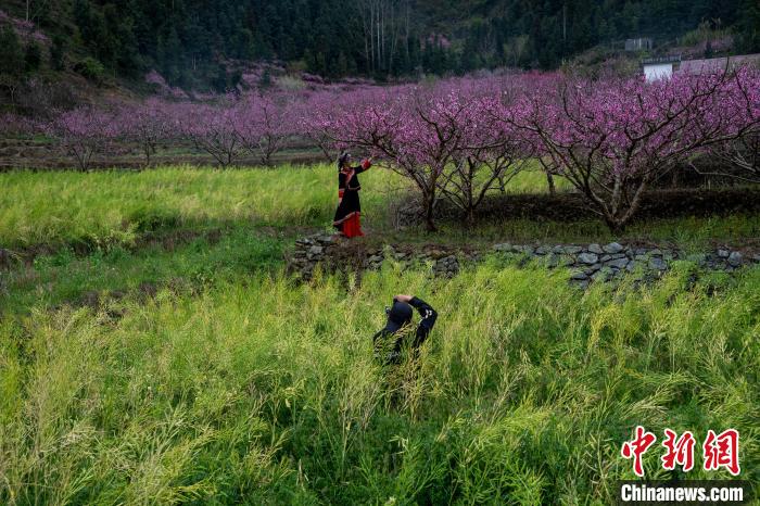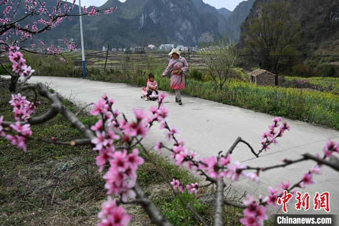 時(shí)下正是桃花盛開的時(shí)節(jié),在廣西田林縣浪平鎮(zhèn)浪平村,村民種植的桃花競(jìng)相綻放。滿樹繁花與錯(cuò)落村舍相互映襯,還有樹旁玩耍的孩童、樹下勞作的村民,動(dòng)靜交織,構(gòu)成一幅絕美的田園春景圖。圖為3月15日,在廣西田林縣浪平鎮(zhèn)浪平村,村民在桃樹下勞作。黃數(shù)情 攝