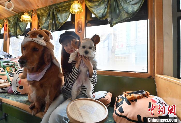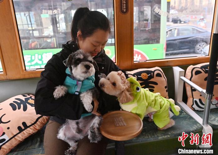 3月16日,吉林長春,寵物和主人在車廂拍照留念。中新社記者 張瑤 攝