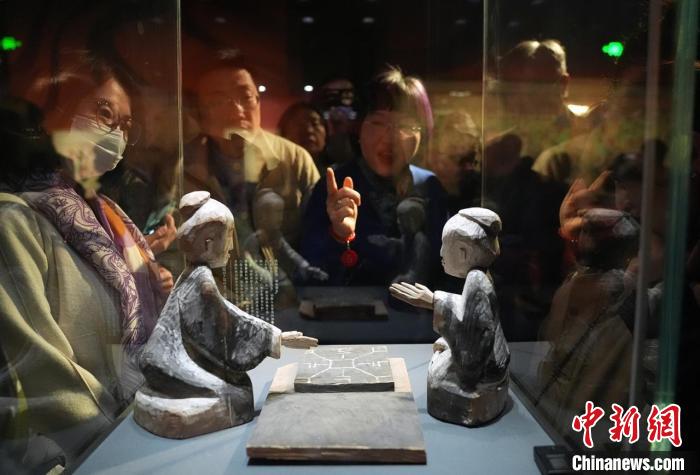 3月30日,觀眾在講解員的引導(dǎo)下欣賞甘肅省博物館藏的西漢彩繪木六博俑。 史春陽攝