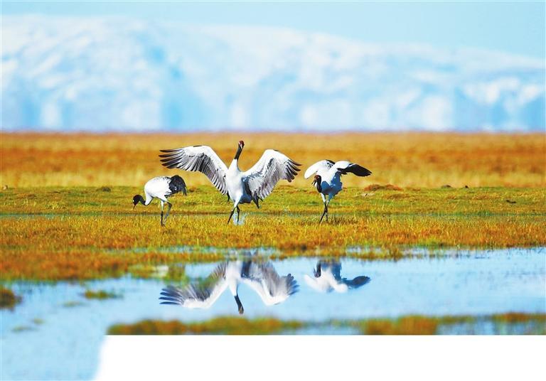 尕海湖的晨霧尚未散盡,黑頸鶴的赤紅色頭頂已經開始閃現。它們在苔草間跳起求偶之舞,頭頂的朱紅隨舞步明滅,如同螢火蟲的閃光。新孵化的雛鶴,棕黃色絨羽間染著乳白,是大地贈予新生命的第一抹色彩。這種國家一級保護動物蹣跚學步時,總被親鳥用長喙輕推,這場景會令保護區(qū)巡護員想起女兒初學自行車時自己的緊張。