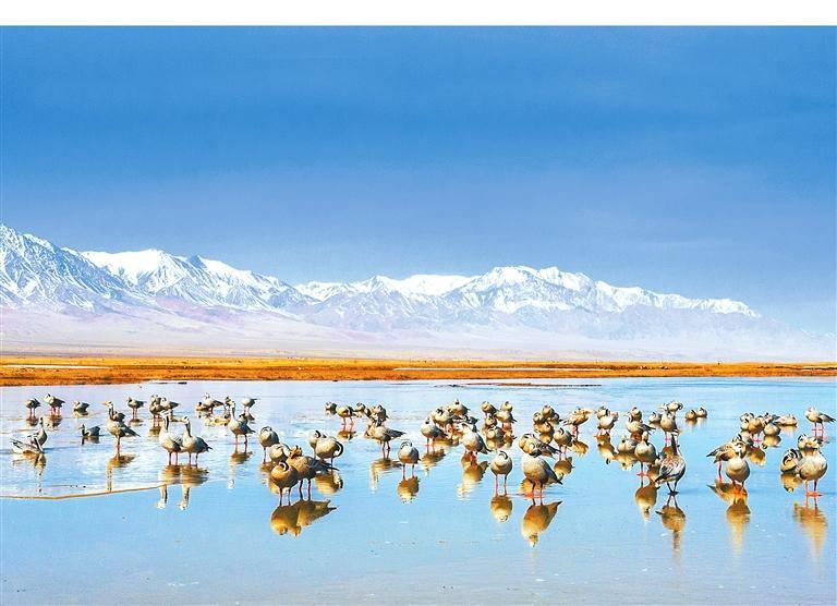 當祁連山的雪線以肉眼難以察覺的速度后退時,鹽池灣的冰封鏡面開始出現裂紋。最先感知到這一變化的不是融水沖刷出的溝壑,而是斑頭雁黃色的喙。它們在三月底的晨昏線上劃過,雙翅呼呼生風。冰凌碎屑尚未與雁羽摩擦,便已發(fā)出細密的簌響,像是古琴開弦前的調音。野馬南山與黨河南山兩山之間形成的盆地內河流縱橫、湖泊密布,草甸、沼澤交錯,是斑頭雁和其他水鳥世代棲息繁衍的場所。盡管先頭部隊在3月下旬就已抵達這里,主力部隊卻要到4月上旬才會姍姍來遲。此時斑頭雁幼體已在越冬地充分發(fā)育,羽衣上幾乎看不到如苔蘚般斑駁生長的新羽,只是頭部的兩條黑帶不如父母深邃,這是它們少經風霜的證明。它們降落在濕地灘涂時,雝雝鳴雁,那聲音或許與兩千年前蘇武牧羊時在北海之畔聽到的有些許相似。