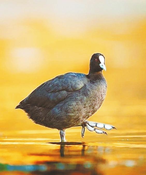 白骨頂又被喚作骨頂雞,卻是鶴類的遠親。它靜浮水面時,額前一抹象牙白,宛若遺落人間的墨玉鎮(zhèn)紙。這枚額甲實為特化的角質層,是為了保護頭部的盔胄?;野咨陌牾肴缪┑匮グ惆洪g,劃開水藻時泛起粼粼波光——這身黑羽配雪蹼的穿搭,竟比時裝周的極簡主義更先鋒。當它們列隊掠過蘆葦蕩,水淼勾勒的剪影里,仿佛在繪制著秋天的信箋。