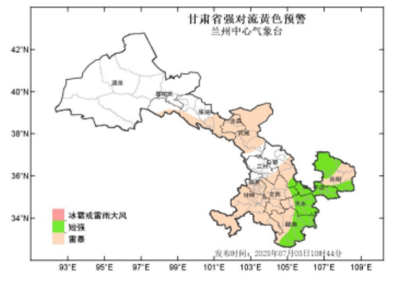 蘭州中心氣象臺2025年7月3日10時44分繼續(xù)發(fā)布強對流黃色預(yù)警:預(yù)計未來24小時,張掖、金昌、武威、蘭州、白銀、甘南、臨夏、定西、隴南、天水、平?jīng)觥c陽等州市有雷暴,其中隴南、天水、平?jīng)觥c陽等市部分地方及白銀、定西兩市局部地方有短時強降水,最大小時雨強20-60mm;隴南、天水、平?jīng)?、慶陽等市強降水在未來24小時內(nèi)多發(fā),白銀、定西主要強降水時段在4日2-8時。請注意防范!